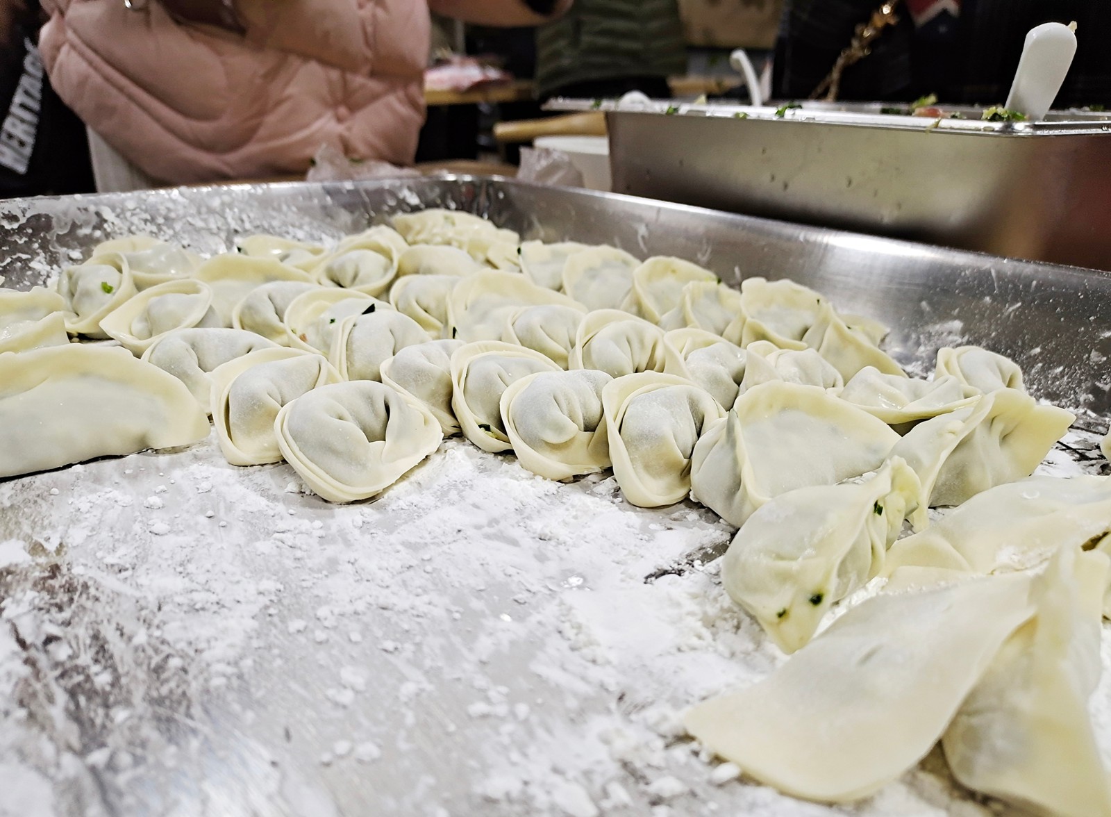 同事们按照自己的喜好,有些包成元宝状,有些包成树叶状,有些包成“饼”状。大家相互调侃着,嘻笑着,气氛异常活跃。还有些同事从家里带来了煎锅做了煎饺,也非常受欢迎,为了尝一口煎饺,同事们竟排起了长队。